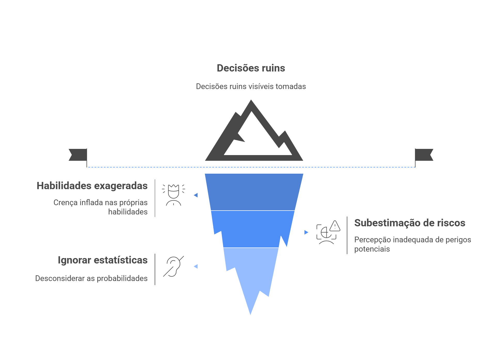 EXCESSO DE CONFIANÇA: O excesso de confiança é a tendência de acreditar que suas habilidades e julgamentos são melhores do que realmente são, cegando você para os seus verdadeiros limites. Esse viés pode ser a causa raiz de decisões ruins e estimativas irrealistas. Ele nos faz subestimar riscos e ignorar conselhos.