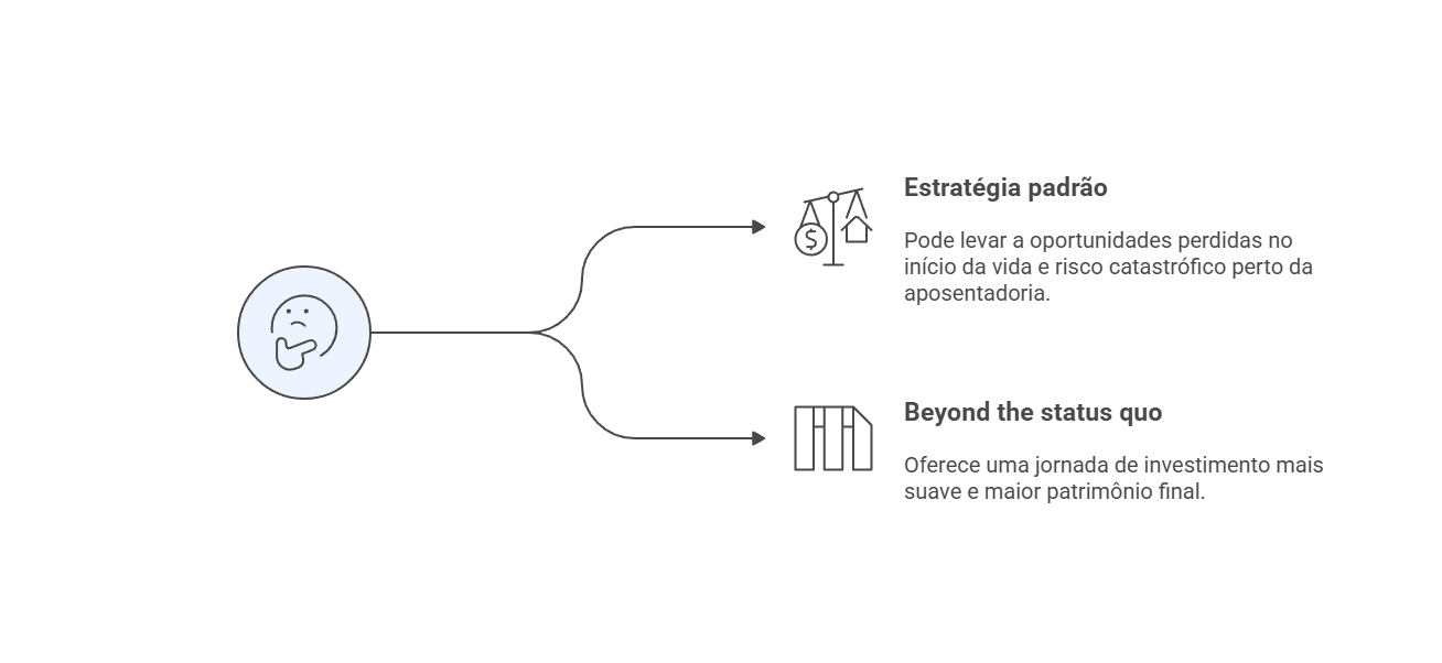A abordagem tradicional deixa dinheiro na mesa quando você é jovem e o expõe a um risco catastrófico perto da aposentadoria. O novo modelo oferece uma jornada de investimento mais suave e, na maioria das vezes, um patrimônio final maior e mais robusto.