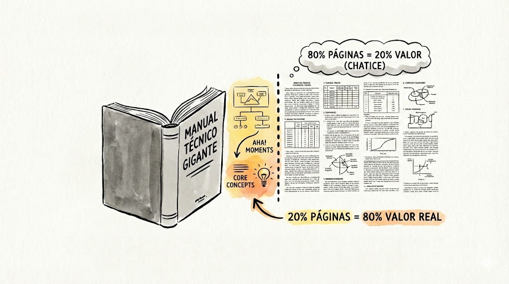 O PARETO DOS CONTEÚDOS: Em quase qualquer livro de negócios, desenvolvimento pessoal ou técnico, cerca de 20% das páginas contêm 80% do valor real da obra. O restante são anedotas repetitivas, exemplos para encher linguiça editorial ou contextos desnecessários.